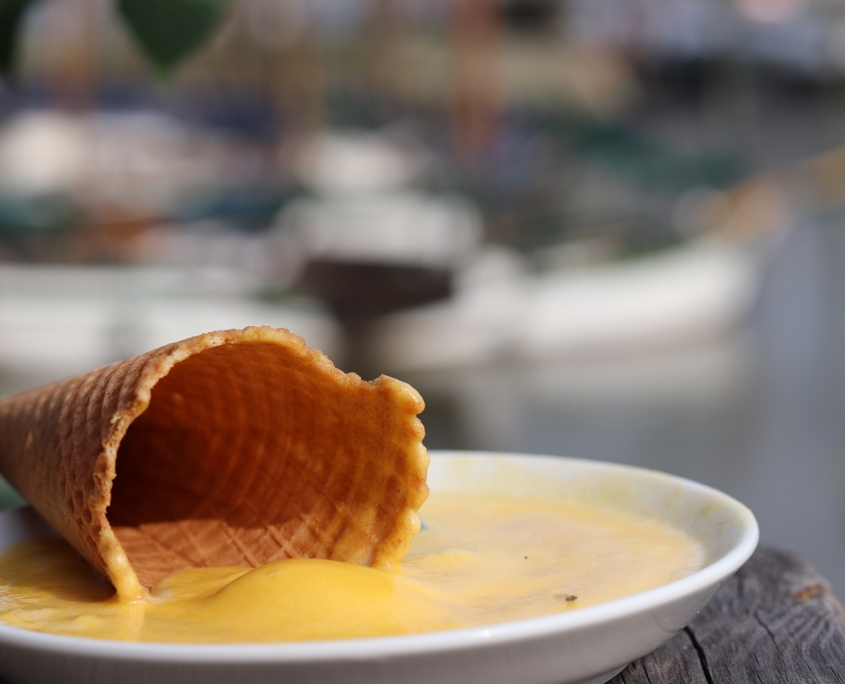 Il caldo cola via il gelato lungo il cono immantinente. Così si scioglie in rivoli, scende in gocce raccolte dal fazzolettino in carta riciclata. Parte furibonda la lingua in una ipotesi di salvataggio tardivo. A volte così tardivo che macchia la maglietta, la gonna, il pantalone. Ghiaccio, acqua calda o fredda in un pallido tentativo di far andare via la macchia, mentre la giornata è rovinata. Sorridiamo rassegnati al piacere rovinato. Ma tant’è.