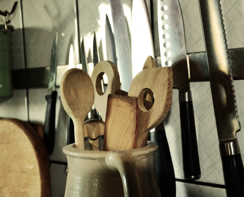 Il silenzio permea dolcemente le cose. Le avvolge ovattandole in un pluriball invisibile. Inerti, mestoli coltelli padelle pendono dall’alto. Il mixer giace quieto in un cantuccio. Bicchieri posate tralasciano il loro tintinnio. Anche il rintocco dell’orologio digitale è senza rumore. Forni occhieggiano pazienti aspettando il loro turno, pronti a trasformarsi in fornaci. Il frigorifero torreggia imponente mandando bagliori verdi lancinando il buio. Nel chiarore dell’alba o del tardo pomeriggio la cucina è sola, in attesa.